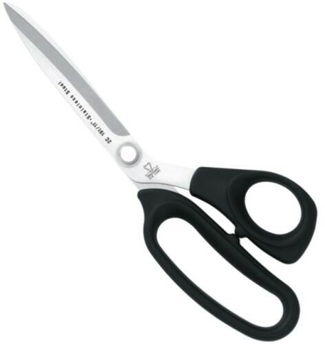 Az olló markolata szögben van elhelyezve, így a penge mindig az asztalon fekszik, amikor szövetet vág.