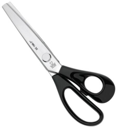 Az olló markolata szögben van elhelyezve, így a penge mindig az asztalon fekszik, amikor szövetet vág.